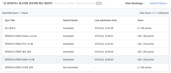 - 모비스 대회 예선 결과가 나왔다. 통과 확률을 50% 정도로 보고 있었는데 생각보다 여유롭게 통과했다..